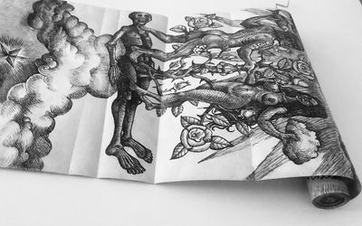The narrative begins and ends with the ouroboros, the eternal symbol of life and resurrection, framing a philosophical and visual journey that alternates between the divine and the human. Elements such as a sun proclaiming, “We are the resurrection of the dead star,” a bottle containing a beating heart, and a golden egg reborn as an angel enrich a story brimming with symbolism. Figures such as gods, angels, dragons, and mythical characters interact within a constantly evolving space, recreating the cosmic dance of creation and destruction.